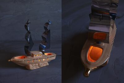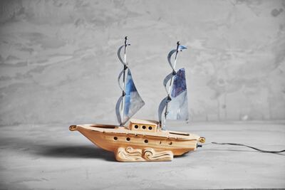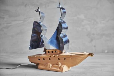 船をモチーフに作られたこちらはアルミ製の帆が印象的で点灯時には舷窓からもれる光がとても綺麗です。