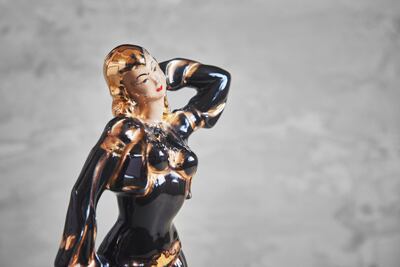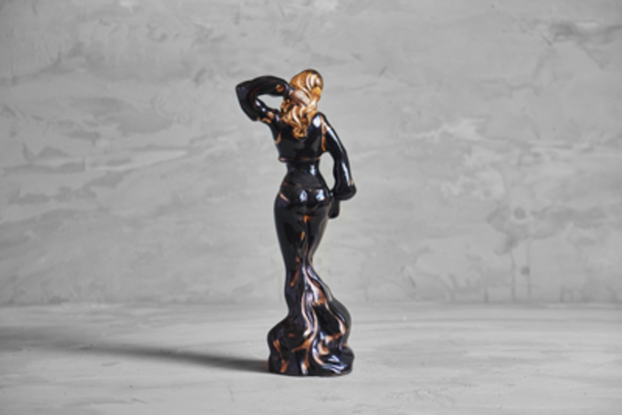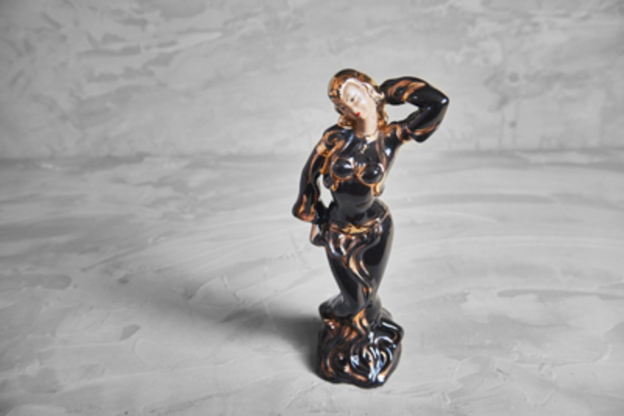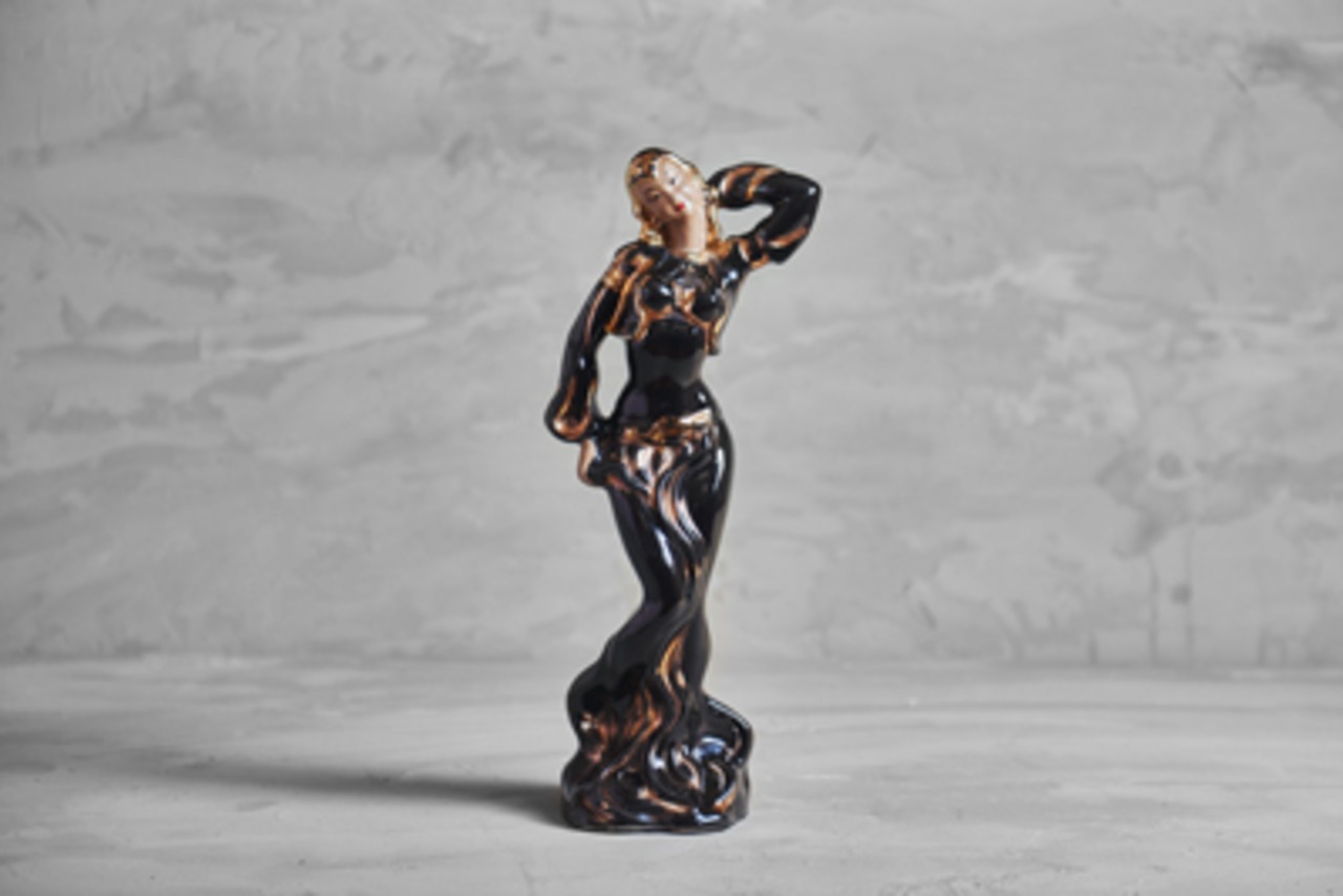 陶器製で丁寧に作り込まれた曲線のシルエットがとても美しく黒と金(50年代に多い色使い)で塗装された艶やかな感じが女性の魅力を引き立てています。