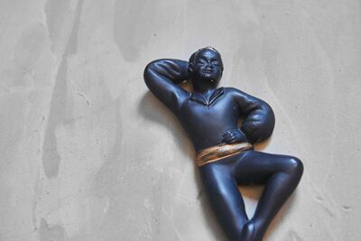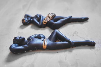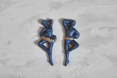 石膏を使って作られていて黒と金(50年代雑貨によく使われたカラー)で塗装してあり対で飾ると見映えしますよ。